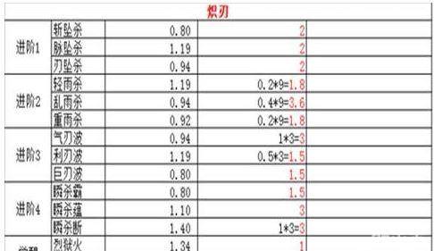 表里边多段伤害0.XX*A,就是以0.XX倍的技能伤害造成了A次攻击,红字是总统计,都是按顺序来的。