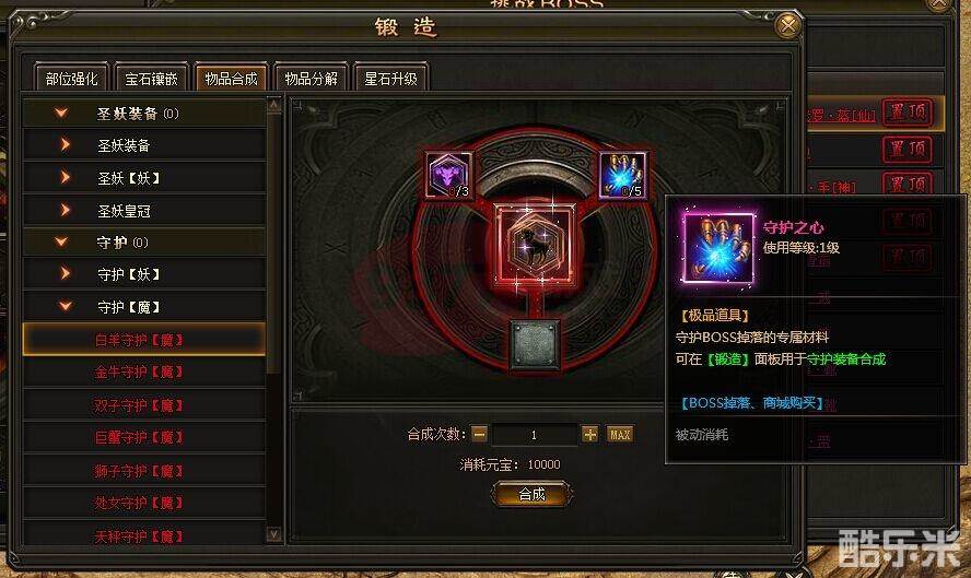其中,妖级守护装备只需要提交3个普通守护和10000元宝,就能够合成的;而剩余的魔级守护、仙级守护两种守护装备,就需要额外花费一些守护之心的材料,才能合成更高一级的守护装备。它们的合成规则同样需要消耗3个相同的前一级守护装备、对应数量的守护之心和10000元宝来合成。
