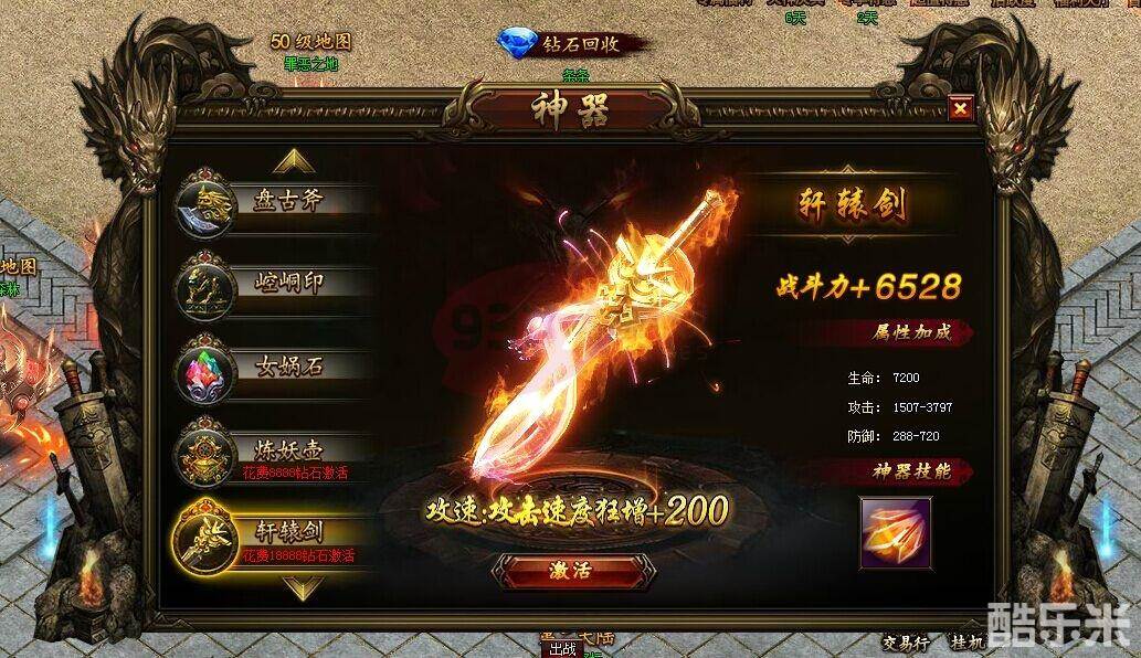 玩家等级达到32级的时候,可以开放神器系统的玩法。玩家直接从游戏界面上方的“神器”图标,进入到神器界面里,可根据该系统玩法说明,去激活各种神器来用。各种神器一经激活,便可永久使用的。