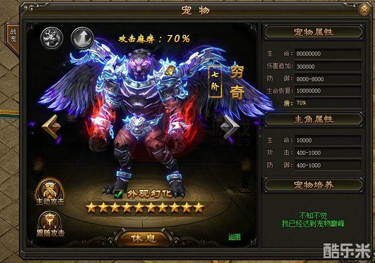 目前,灭神迷失传说宠物满级为7阶,按照宠物等级低高,依次有一阶白虎、二阶乘黄、三阶睚眦、四阶狻猊、五阶梼杌、六阶寅虎、七阶穷奇。玩家进阶宠物后,每一阶宠物的造成都是不同的,随宠物等级提升,玩家可获得更多的宠物属性和主角属性的。