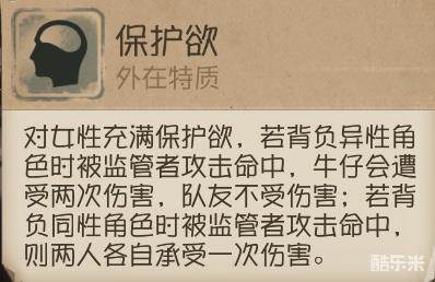 牛仔的保护欲技能是个重女轻男的技能,抱着女性求生者可以保护其不受伤害,抱着男性求生者会各获一次伤害,是个舍己救人的神技。