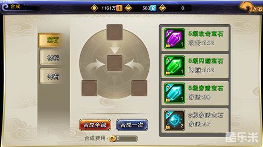 该系统是将低级的道具合成更高级的道具,分为宝石合成、材料合成以及丹药合成