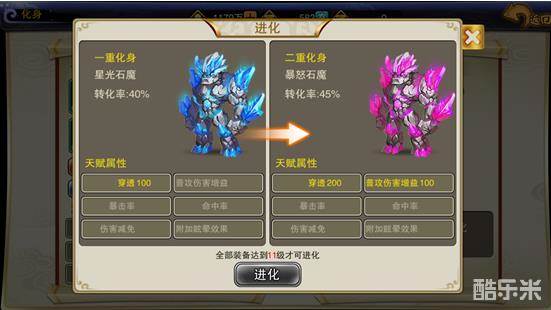 化身进阶后可以获得专属的天赋属性,新的化身外形,同时还可以增加化身的转换率。