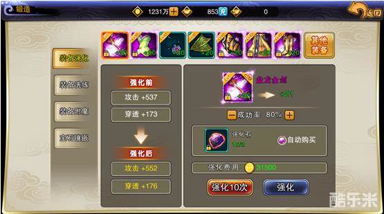 强化有失败的风险,失败不掉级只浪费强化石与金币,想要提高强化成功率可以点击界面中成功率后面的‘+’增加成功率(会消耗一定数量的元宝)。
