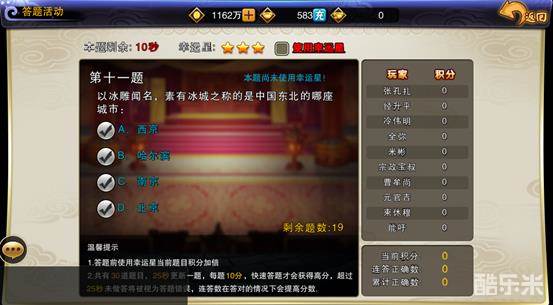 玩家通过答题来获取积分排名,每次30题,每题有30秒的作答时间,对于有把握的题目可以使用幸运星,奖励将会加倍。该活动每天中午12:00开启,持续时间25分钟。答题时,回答题目花费的时间越少,连续答对的题目越多,获得的分数也越高。