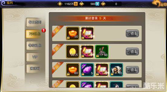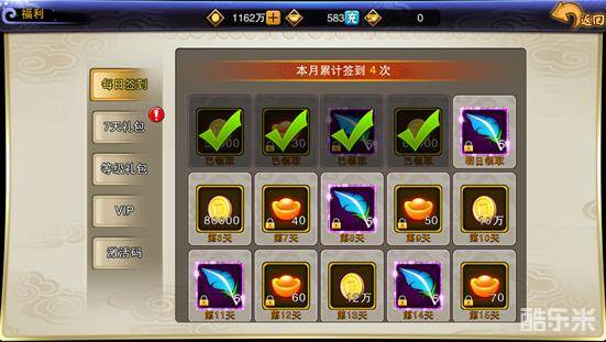 福利分为每日签到、七天礼包、等级礼包、VIP礼包、激活码