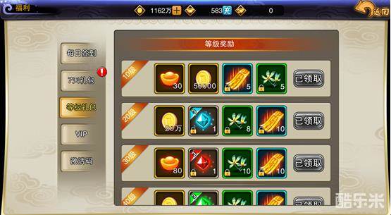 等级礼包:只要在游戏里达到符合条件的等级就可以领取,每10级可领取一次,等级越高,奖励就越丰富。