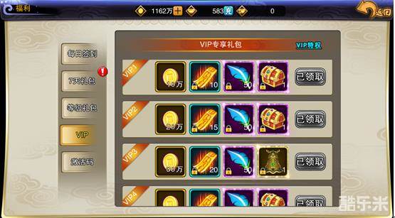 VIP专享礼包:充值后升级VIP等级,VIP等级越高权限越多,当然,可以领取的VIP礼包也会越多,VIP等级越高,对应等级的VIP礼包内容就会越丰富。