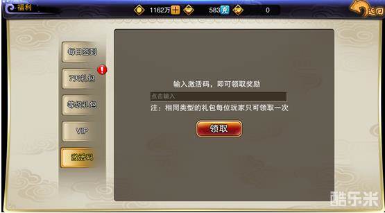 激活码礼包:只要输入激活码并点击领取,就有相应的礼包发送到邮件,在邮件里领取获得的礼包。相同类型的礼包只能领取一次。