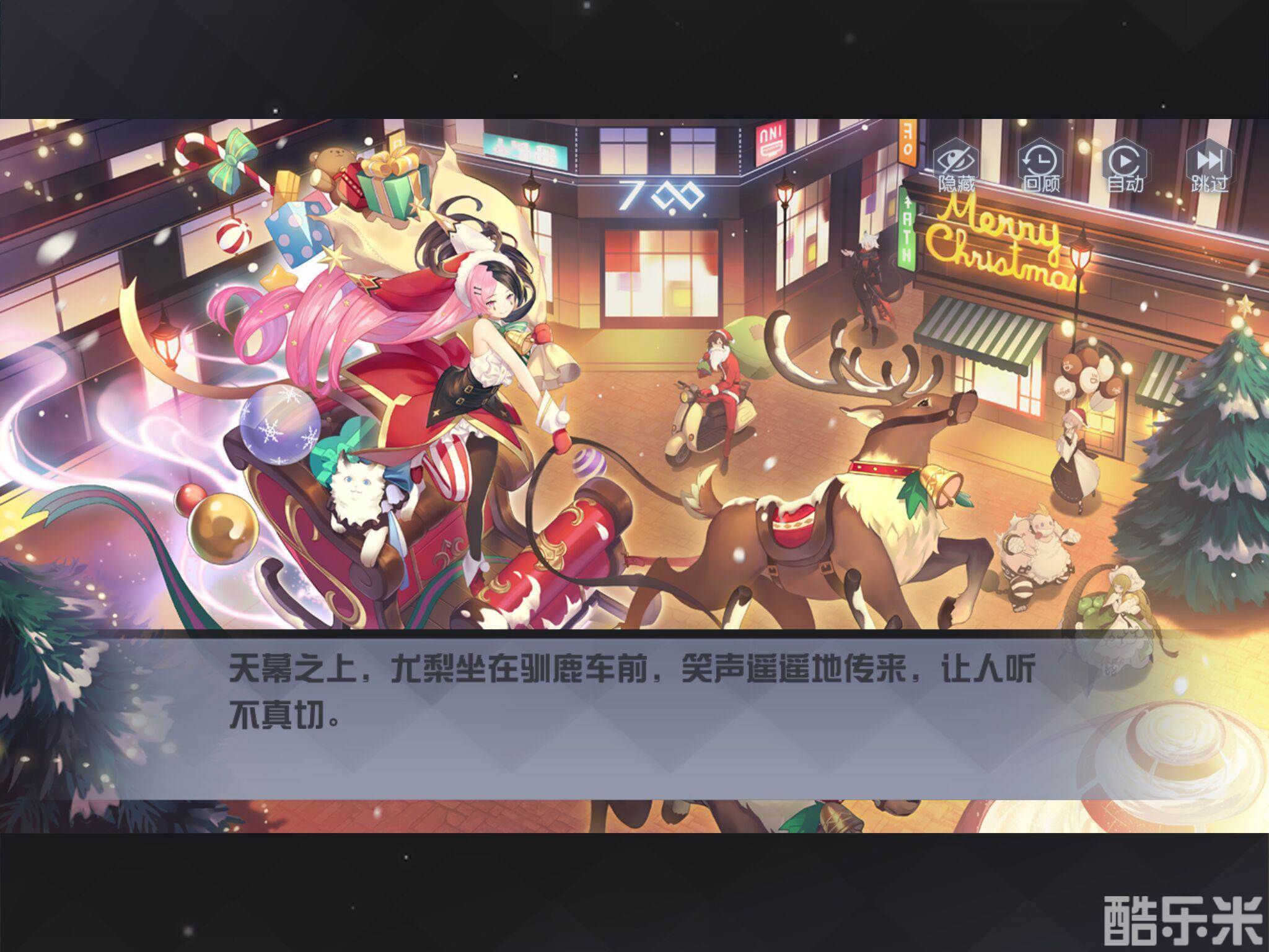 清晨的雪花随风轻舞,枝梢上的铃铛哼唱着轻快的旋律,尤梨乘着驯鹿雪橇,正在挨家挨户地派送着圣诞礼物和祝福,快坐上雪橇,一起当一回交界都市里带来爱和温暖的信使吧。