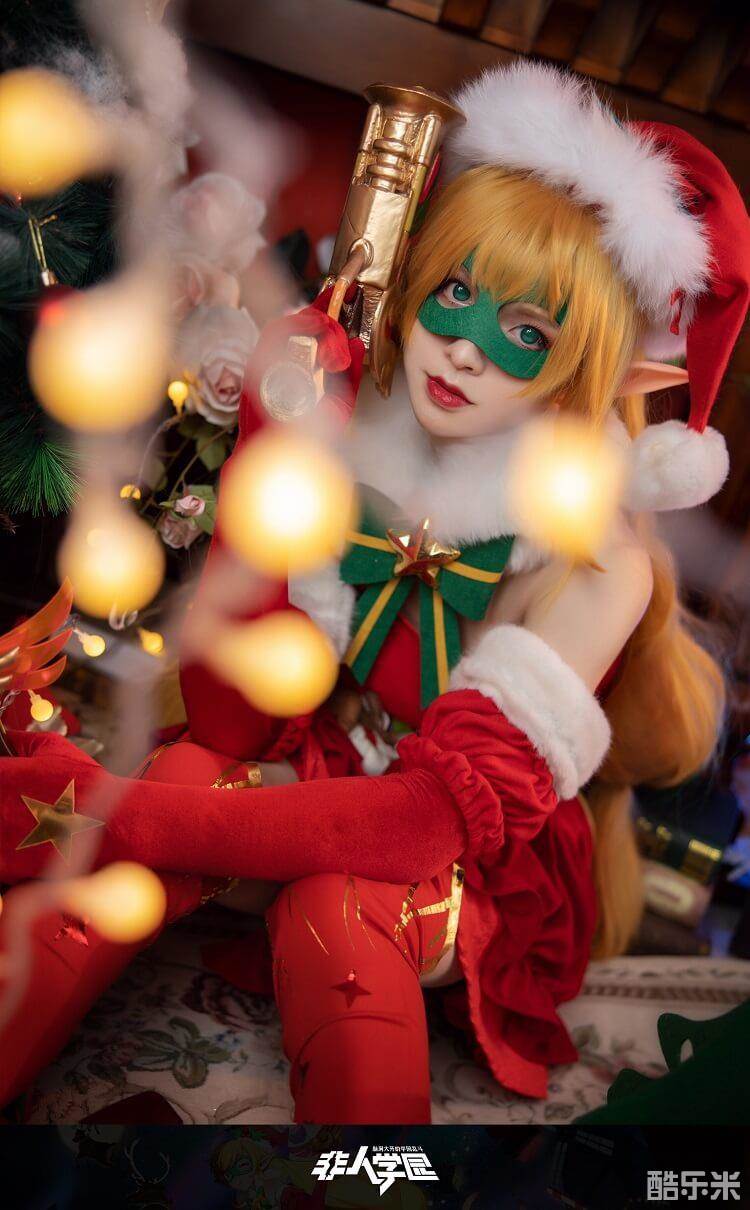 除了在学园派发惊喜福利,由知名Coser你的糖分带来的白灵圣诞使者COS,还将突破次元壁,亲自给各位同学送上节日的祝福。这一组作品,以明红色贴身剪裁的短裙、华丽丽的长筒袜,衬托出了白灵修身性感的身段。