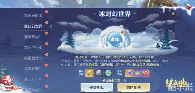 然而,总有妖魔不愿人间祥和。如那出现之际便会冰封千里的“冰封之魔”,便趁着圣诞节出来搞事情!每天12点至14点、18点至22点两个时间段里,天命者们都可以前往挑战、阻止它为祸人间的阴谋,成功即有幻彩虹光等奖励送上,还能收集“奇缘卡”、赢取绑定元宝、圣诞喜礼等额外奖励!
