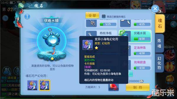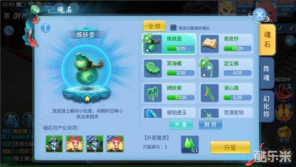 当收集足够的魂石碎片后,就可以解锁对应的魂石,然后我们就可以利用解锁后的魂石去制造该魂石下的幻化符。以炼妖壶为例,在解锁后我们就可以制造懒太郎和红翼蝶女的幻化符(具体作用下文说明)。而幻化符的星级跟魂石星级一样,推荐各位先尽量提升魂石的星级,这样制造出来的幻化符才更为实用。