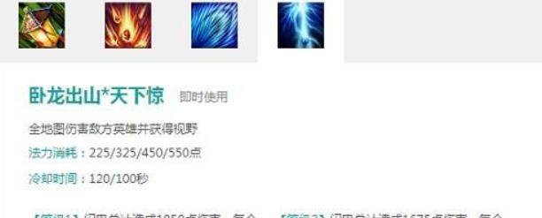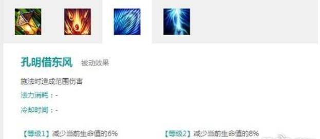诸葛的最强技能,诸葛后期的输出杀手锏。不论诸葛使用什么技能,都会对周围的地方英雄造成生命值百分比的伤害。此技能决定了诸葛是一个打前排的法师,冲到敌军阵中,一轮技能,就可以将敌人打残,就算自己阵亡了,队友也可以进行收割。