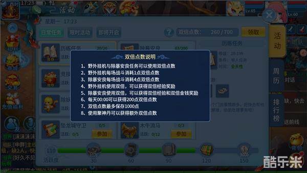 3.领取双倍。在活动界面里即可领取,一般用来做除暴,可获得双倍经验和金钱奖励,每次除暴需要消耗4点,每天0点恢复200点,保存上限为1000点。记得及时消耗免得浪费。