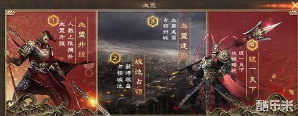 加入血盟之后,血盟的四个玩法将会自动解锁,包括血盟升级、城池占领、血盟建国和统一天下。点击“血盟”按钮,主公可进入血盟系统中。在血盟系统中,主公可直接参与攻城活动和科技建设活动。当攻城活动正式开始后,主公可在血盟中领取“补给”的资源,来提高部队作战能力。