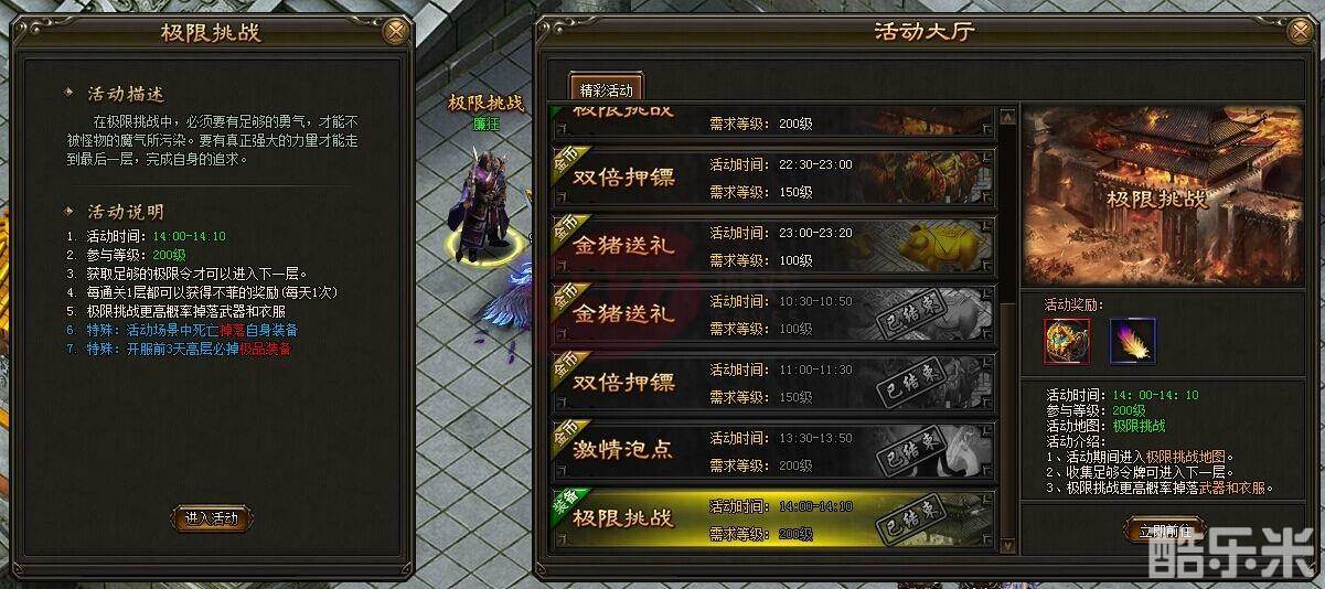 当该活动正式开放的时候,玩家就可以通过NPC,传送进入到活动场景的。玩家在活动地图内,需要按照地图层数逐层进入。在每层里都分布各种不同等级的BOSS,层数越高BOSS等级越高。玩家每进入一层,都需要一些极限令牌的道具。这些令牌道具,可通过击杀各层地图里怪物掉落获得。玩家每进入一层活动地图,都会有一些奖励有元宝、幻羽等奖励,每层奖励每天只能领取一次。
