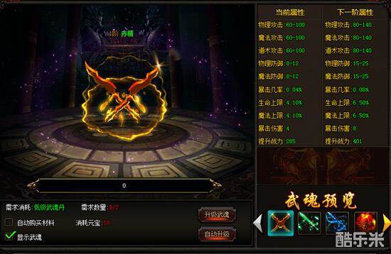 开服第二日登录即可开启武魂功能,初阶武魂即可提高玩家的大量属性,武魂等级越高,属性越多。