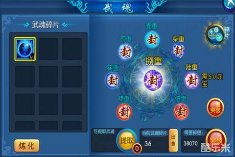 · 武魂突破:通过武魂突破界面获取武魂,每成功突破一层需要消耗对应的银两;同时获得对应数量的武魂碎片,突破武魂的层数越高,进行提炼后获得的武魂品阶可能越高。