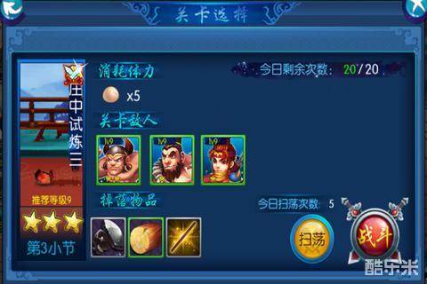 · 普通关卡:普通关卡挑战消耗体力,每次5点,根据通过的评分,给以战斗评分星级奖励。当评分达到3星时,下次挑战可以直接扫荡。每个章节的星星获得属性达到一定程度,可以领取该章节的,章节挑战奖励。