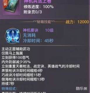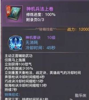 建议搭配神机兵法上卷,可以大幅度增加杨门傲血各个技能的效果,仅限马上施展这一点特性几乎是为杨门量身定做,可以提高杨门的击杀效率。