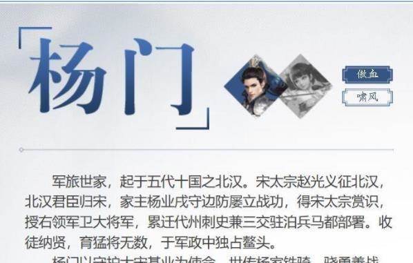 杨门目前分为两个流派,啸风和傲血,傲血防御高血厚,擅长突进突围,啸风则使用长弓,为队友进行·远程的牵制。