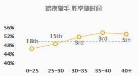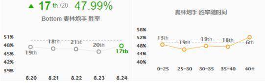 小炮的胜率在8.24b版本中也有着不错的提升,从小炮的胜率随时间曲线来看,在40分钟后小炮的胜率达到了第六位这个点说明了小炮在8.24b版本是一名后期给力英雄。