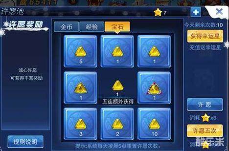 宝石全部为至尊宝石,许愿中最高奖励为10颗一级的至尊宝石,这可以合成1颗至尊宝石Lv3和1颗至尊宝石Lv1,而最低的则只有1颗至尊宝石,但由于宝石的价值很高,所以差别也可以说是天差地别。并且此处的许愿所需的幸运星是6颗,而不是前面两个奖励所需要的1颗,它的五连则需要30颗幸运星,可以说几乎整个活动开展玩家恐怕也攒不起几次五连吧。