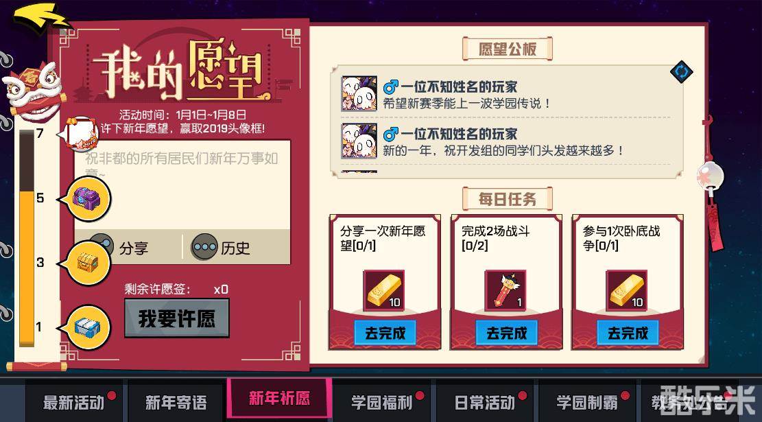 喜迎新年,非都新年许愿树以及首席许愿官晓音都已就位,每一个愿望都将被实现!1月1日至8日,每天完成任务都能获赠1枚许愿签,还可通过完成任何获取更多许愿签,只要在许愿签上写下愿望,就能向主城的许愿树许愿了。累计完成7次许愿,还将获得【2019新年头像框】喔!