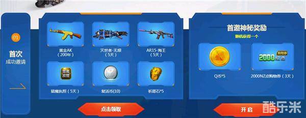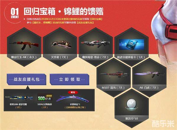 老玩家接受好友的邀请不仅可以领取回归宝箱,永久的镶金红玉AK、灭世者、幽冥毒皇、混沌、白虎等一众神器直接领,更有战友应援礼包,极寒冰神、购物券、祈愿树枝免费拿。完成相应的任务,老玩家同样可以开启宝盒,祈愿免单锦鲤。