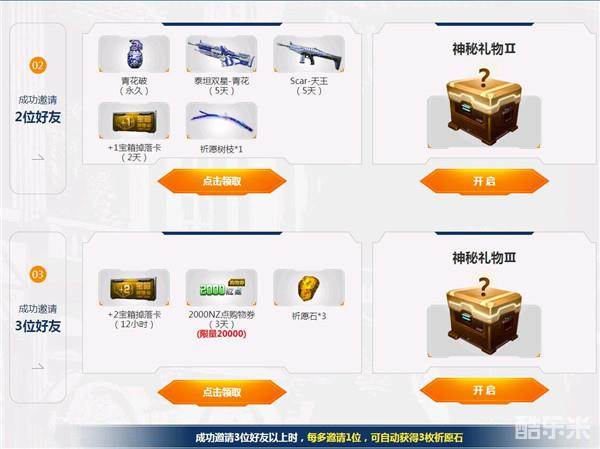 邀请好友可获得祈愿石以及祈愿树枝等道具,该道具可用于开启开启宝盒,宝盒中蕴含着灭世者、泰坦双星、Q币大奖、免单锦鲤等豪华大奖。本次活动对于邀请人数没有上限设置,原则上玩家邀请得好友越多即可开启更多次的宝盒,开启十次无暇宝盒可百分百领取免单锦鲤,赶紧去邀请你的好友加入逆战世界吧!