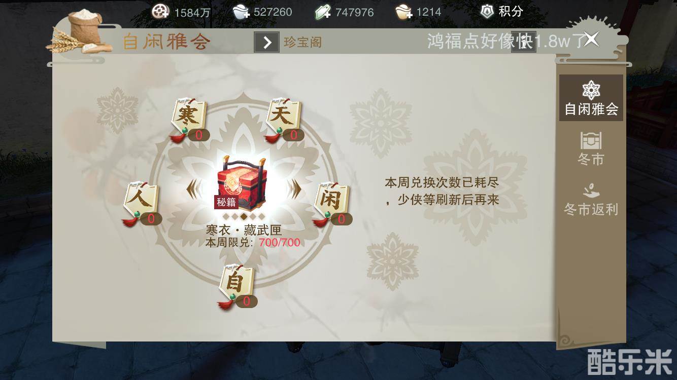 1.参与“冬令进补”和“秋收冬藏”活动将随机获得一种寒衣冬令,集齐“天、寒、人、自、闲”五种冬令可以兑换寒衣宝匣