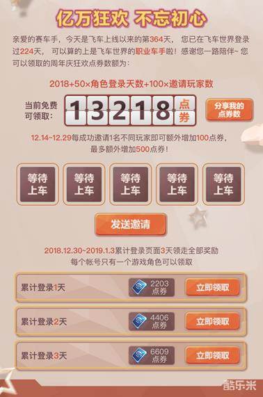 每位车手可获得点券数量=2018+50*角色登录天数+100*活动期间邀请玩家数。
