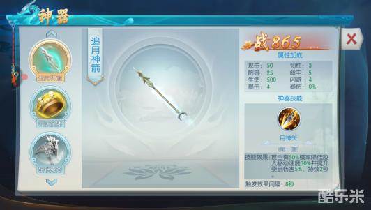 一、 玩家完成主线任务可获得第一件神器:追月神剑,点击“神器”可进入神器界面