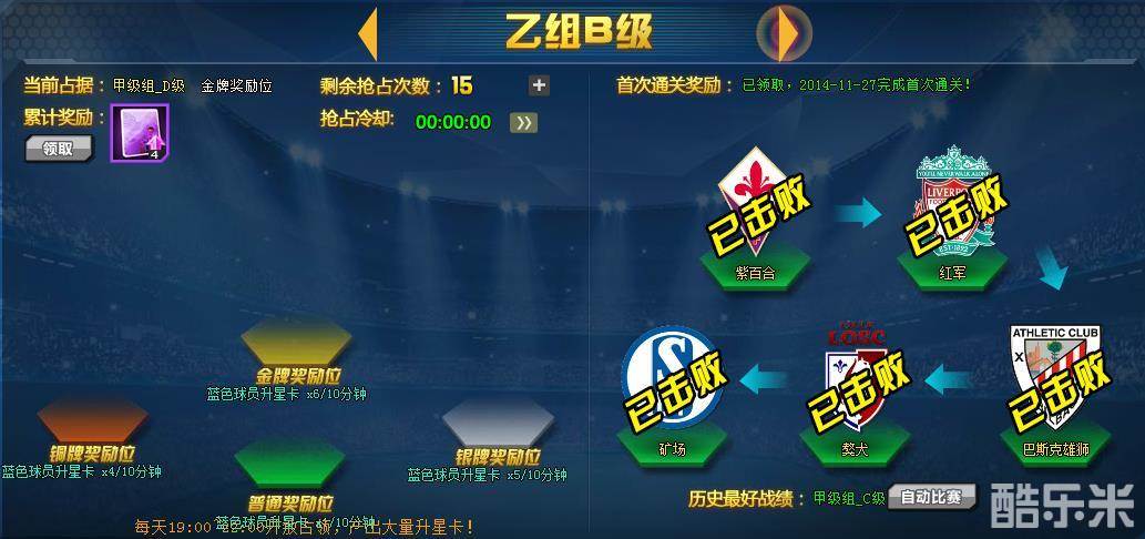 这个应该很多玩家都知道,但是只是顺带提一提。有些玩家可以会执着于同一组别的位置但是这个不是先到先得的,位置随时会被战力高于你的人抢走所以担心受怕还不如选个安稳的位置。大家可以看下图,我举例乙组B和乙组C。其实大家如果注意看的话B组银牌位置的得卡量和C组第一是一样的,如果实力不能在B组占金牌位置竞争又激烈的话为什么不降一个级别到C组拿金牌位置呢?我之前有看过B组铜牌位置的玩家战力高于C组第一,所以才会想在这里提一提。