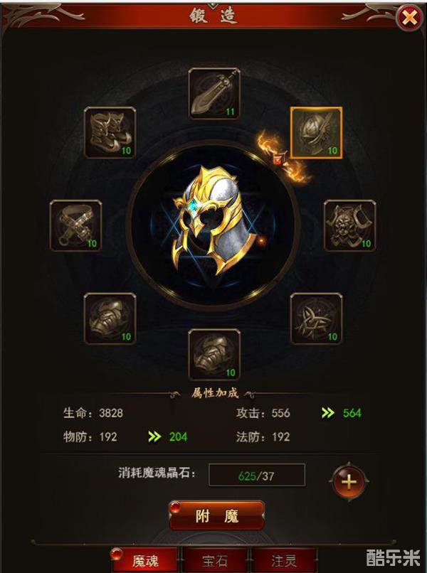 魔魂系统通过消耗魔魂晶石提升装备部位的属性值生命、攻击、物理防御、法术防御的属性值。