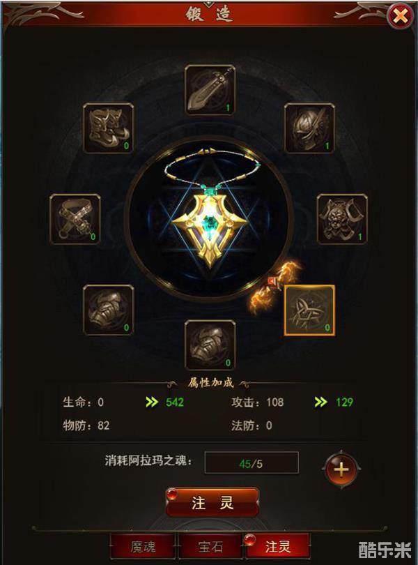 注灵系统通过消耗阿拉玛之魂提升装备部位的属性值生命、攻击、物理防御、法术防御的属性值。