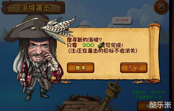 朗姆酒其实还有一个很重要的消耗点,那就是海域袭击的搜索,在海域袭击中通过袭击不同的船只可以获得不同的游戏资源,钻石、铜币、朗姆酒都可以获得,但每次袭击的时间较长,免费搜索的时间更长,所以建议各位要根据自己的需要进行袭击,200朗姆酒只袭击携带朗姆酒的船只就可以回本了。