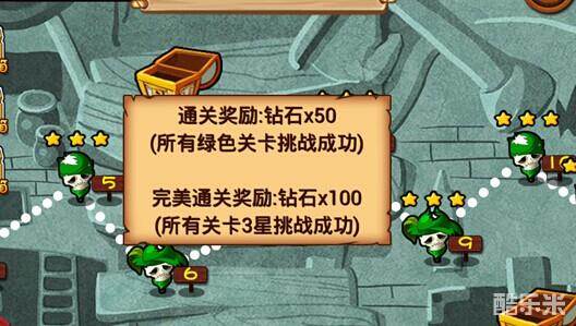 二是关卡的通关奖励和完美通过奖励,只要绿色关卡全部挑战成功即可获得50钻石奖励,而完美通过,所以关卡全部三星通过(包括蓝色和红色关卡)就可以获得100钻石奖励。