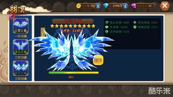 消耗材料可使羽翼获得一定的成长值,每当成长值达到一定额度则提升1颗星级;