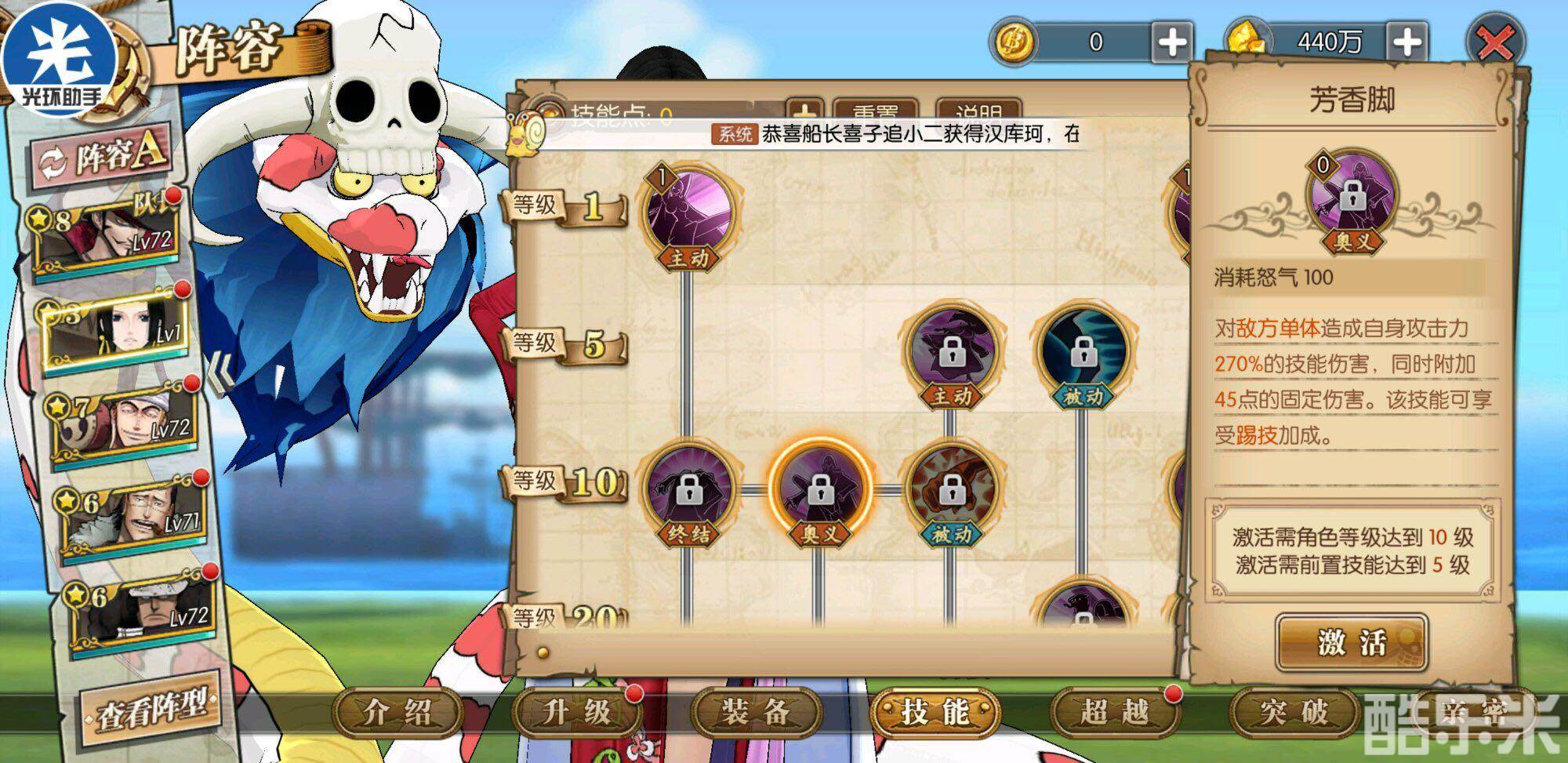 女帝有2个踢技加成的主动技能,和山治的2个一样,一个100%2魂玉,一个150%3魂玉。