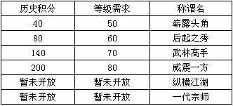 历史积分的获得来自于每次武林大会的“本次积分”累加而得,历史积分只增不减,不会随着当前积分的消耗而改变;达到一定值时会在离场时自动获得称谓。