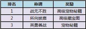3、积分奖励:每场战斗结束后,存活的队员能获得一定活动积分。活动积分可以累积,1点积分可以在襄阳郭靖处兑换5点宠物寿命。每次活动积分排行前三名,可以获得称号和额外的道具奖励。