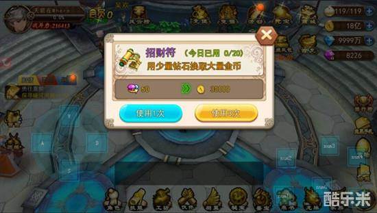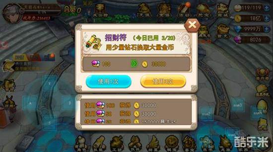 招财符是每天只有20张,玩家可以通过50绑钻换取30000金币,但次数有限。