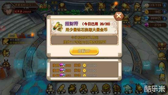 每日的招财符用完之后。就不能购买金币,而唯一能提高招财符数量的方法只有提升VIP等级,才可以增加购买金币的次数。