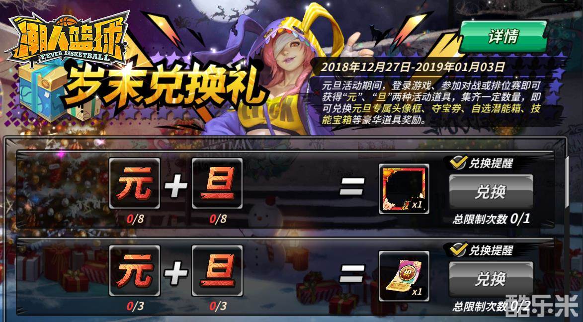 喜迎新年,潮篮相伴,潮人篮球元旦活动惊喜连连。活动期间各位潮篮er只要登陆游戏、参加对战或排位赛就能获得“元“、“旦”两种活动道具,集齐一定数量的“元旦”道具就有机会获取元旦专属头像框、夺宝券、自选潜能箱和技能宝箱等惊喜奖励。?当登录天数累计到一定数值,还能获得包括海量钻石、烈火币、元旦称号的登录豪礼。