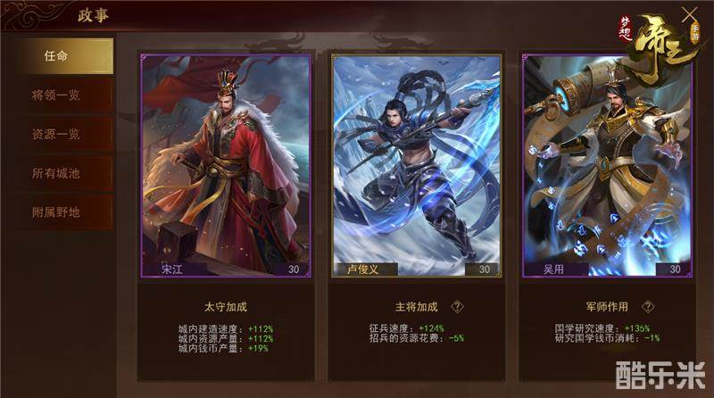 内政非常佛系,自由城建,想建哪建哪,建多少自己当家做主!内政这块自由度非常高,税收、民忠、军饷都可以自己自由调节。3个分城的设定可以让玩家针对性的选择城池的发展方向,可以作为卫城兴建军营、校场练兵充实军力,也可以建造大量民居发展经济。