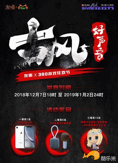 360游戏狂欢节联手友唱打造“古风好声音”,打造最火爆的线上音乐选秀。即日起至1月2日,通过360游戏狂欢节活动主页点击K歌练习下方的“点击前往”,即可获得20点能量;进入活动主页,使用微信扫码报名,根据规则指示参与演唱活动获得评分,活动结束前会依照参赛者的评分进行排名,前16名参赛者将获得友唱提供的iPhone XR、IK8穿戴式K歌神器以及360游戏豪华大礼包+限量手办/电竞套装。秀出你的好声音,夺取终极大奖吧!