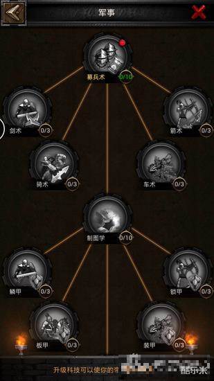 军事科技从总体上可以分为:募兵术,制图学、军团和领导力,他们又各自拥有低中高的分类。