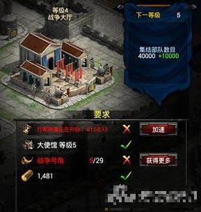 大使馆的等级提升的话难度倒是不大,但是战争号角的获取难度就比较大了,并且随着战争大厅的等级提升,升级需要的战争号角也就会越多,建议玩家如果想要快速的升级战争大厅,那么就存多点金币,这样才能让我们快速的升级战争大厅。